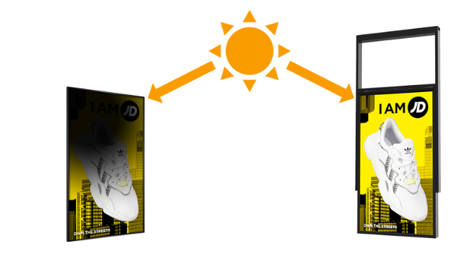 LCD panels exposed to direct sunlight often face temporary ‘blackout’ issues. However, Beten window displays are equipped with a specialised ultra-high brightness panel capable of withstanding surface temperatures of up to 110°C, preventing this problem.